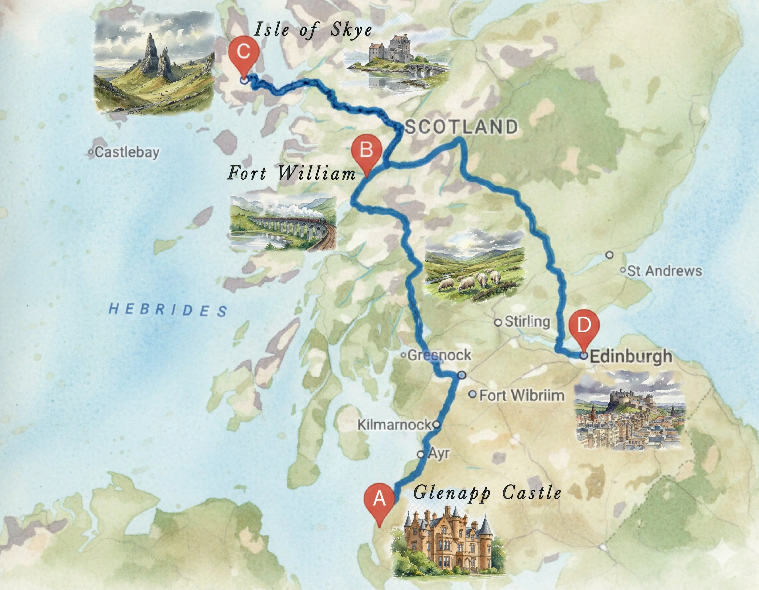 Route Highlights: Departing from the stunning Ayrshire coast, you'll journey north through Loch Lomond & The Trossachs National Park. The route takes you along the western shore of Loch Lomond, past the charming village of Luss, and through the dramatic Glen Coe - one of Scotland's most spectacular valleys. Keep your cameras ready for towering mountains, cascading waterfalls, and possibly some Highland cattle!